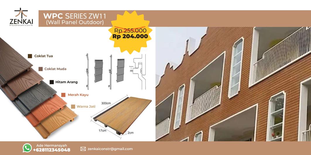Fasad Bangunan: WPC digunakan sebagai material untuk fasad bangunan karena memberikan tampilan yang estetis dan modern serta tahan terhadap kondisi cuaca ekstrem.