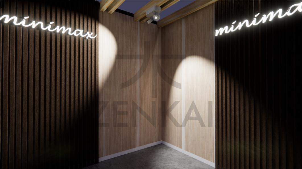 Desain booth untuk Minimax di acara Boon Market TSM, aplikasi pemasangan lantai SPC dan wall panel Zenkai series ZW3. Dengan menariknya booth tersebut dapat memikat pembeli sebagai point of interest di even tersebut.